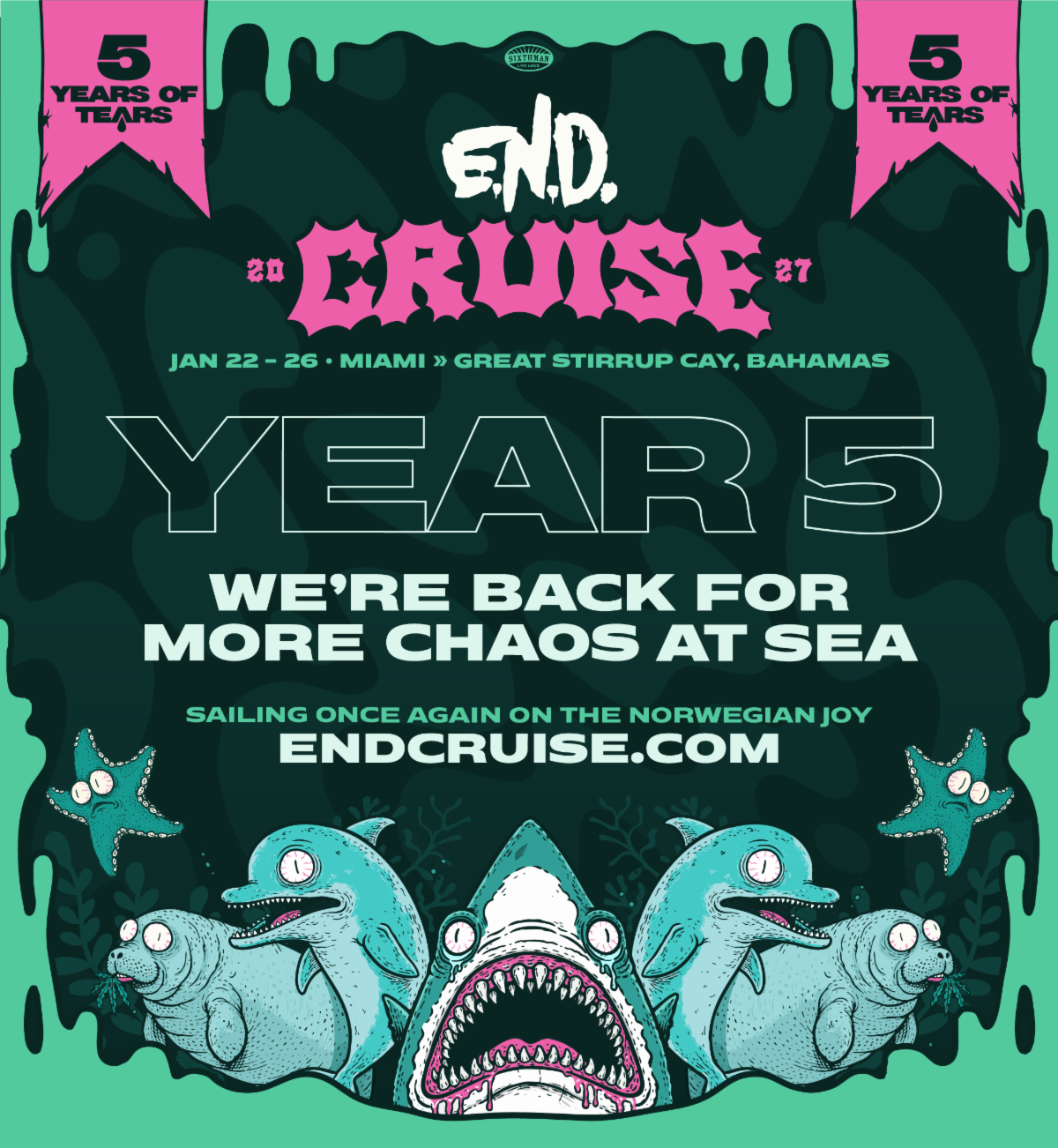 Celebrating 5 years at sea, the E.N.D. Cruise is taking off on January 22-26, 2027, and running from Miami, Florida, to Great Stirrup Cay, Bahamas. So, basically, you can still get a tan in the middle of January if you so choose. (No shame if you’re an emo who likes to hide from the sun.)